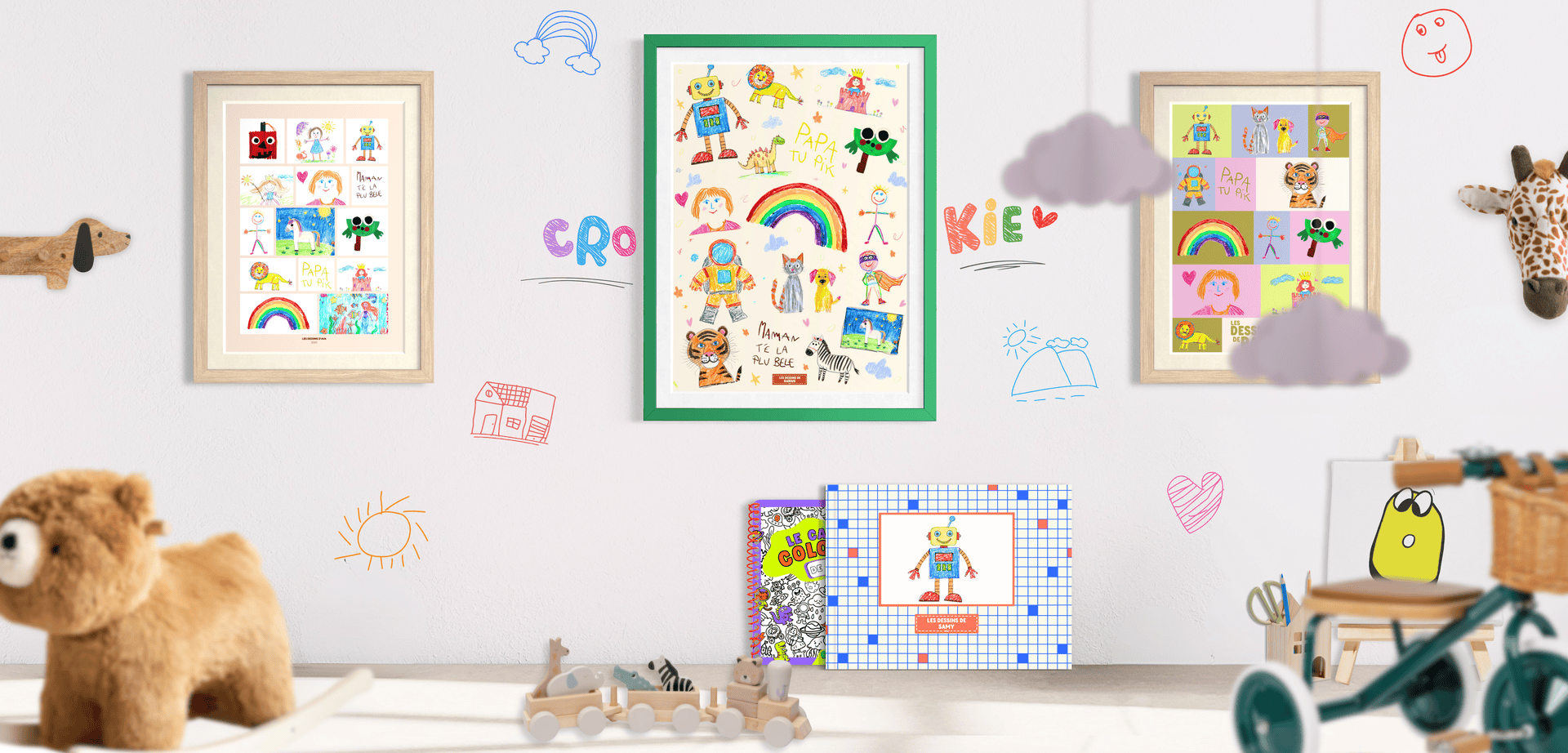 Entièrement créé à partir de ses dessins. Un album souvenir à feuilleter, une affiche déco à accrocher, un cahier ludique à colorier : ses dessins prennent vie et prolongent sa créativité, encore et toujours.